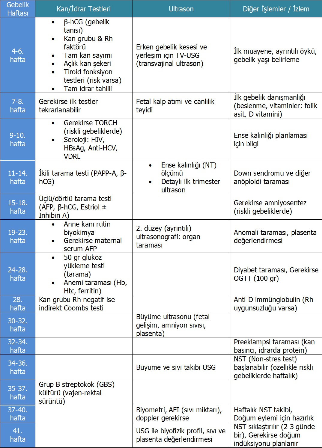 Gebelik takibi için kadının kilo, boy ve tansiyon değerleri önemlidir. Her kontrolde ölçümler alınıp kaydedilir. Kadının rutin fizik muayenesi yapılır. Gerekli rutin kan ve idrar testleri istenir. Eğer annede bir sağlı sorunu varsa buna yönelik gerekli testler ve tedavi planı yapılır. Tam kan sayımı, rutin biyokimya analizi, kan şeker düzeyi, hepatit testleri ve gebelikte önemli vitamin değerleri kan alınarak yapılır. Ayrıca anne kan gurubu tespiti yapılır.